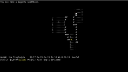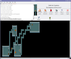 [muokkaa]NetHackin käyttöliittymä on tekstipohjainen, jossa esimerkiksi pelaajaa kuvataan @-merkillä ja hirviöitä eri aakkosilla. Peliin on kuitenkin saatavilla epävirallisia graafisia käyttöliittymiä: