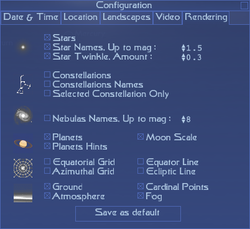 [[Kuva:|thumb|250px|none]]Yötaivas – Tällä toiminnolla saadaan yötaivas näkyviin tai pois näkyvistä. Tätä toimintoa voidaan hyödyntää kun halutaan nähdä kaikki tähdet jotka ovat valoisaan aikaan taivaalla, mutta eivät valosta johtuen näy.