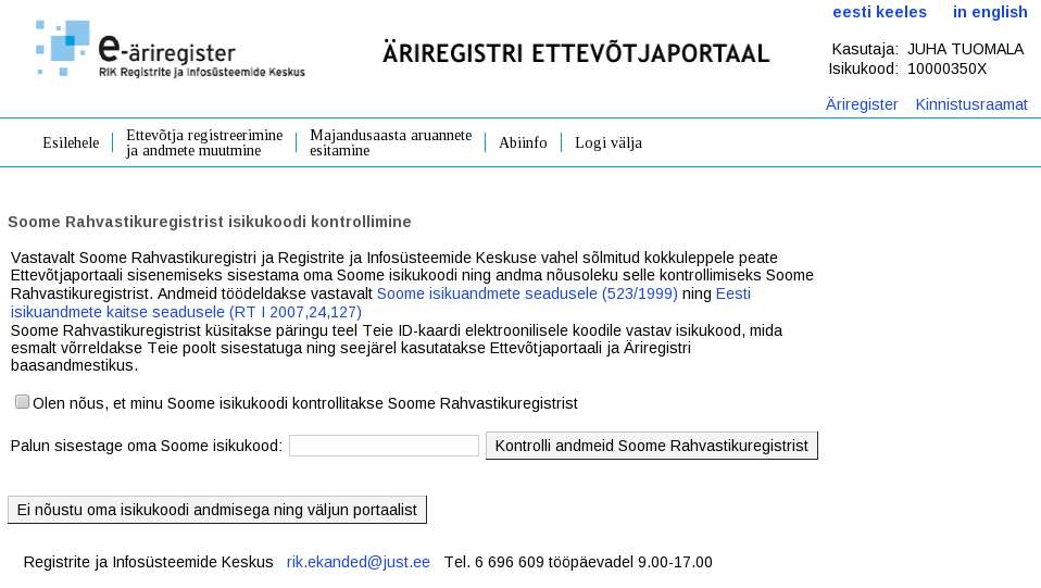 Versio hetkellä 8. toukokuuta 2011 kello 21.51 – tehnyt Tuju (keskustelu | muokkaukset) (Kuvakaappaus Viron yritysportaalin (Ettevõtjaportaal) sivusta jolla Suomen SATU (sähköinen asiointitunnus) ja virolainen henkilötunnus sidotaan toisiinsa.)