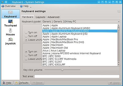 KDE:ssä asetuksissa on valinta Applen alumiiniselle näppäimistölle, mutta valinta ei tuntunut vaikuttavan samalla tavalla (Fedora 18) kuten kernelin iso_layout muutos. Jäi epäselväksi tulisiko sen vastata sitä vai mitä asetuksen pitäisi muuttaa.