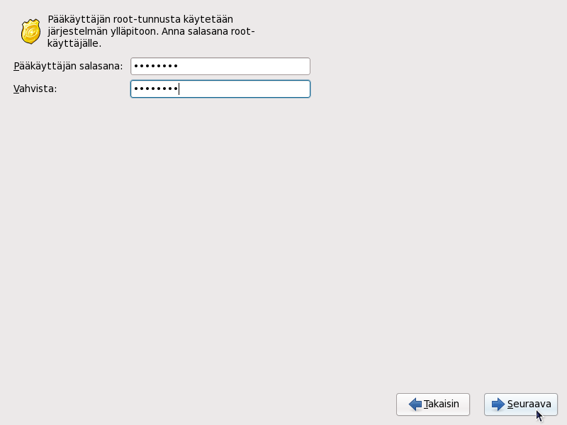 Valitse pääkäyttäjälle sopiva salasana ja kirjoita se molempiin ruudulla oleviin kenttiin. Jatka napsauttamalla Seuraava-painiketta.