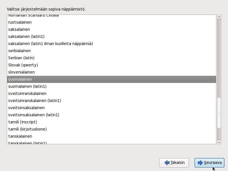 Myös itse asennusohjelma mahdollistaa näppäimistökartan valinnan. Varmista, että valinta on näppäimistöllesi sopiva. Jos valitsit oikean näppäimistökartan jo kirjautumisruudussa, ei tässä yleensä ole syytä muuttaa valintaa. Jatka napsauttamalla Seuraava-painiketta.
