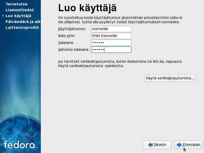 Kun olet täyttänyt käyttäjän tiedot kenttiin, jatka napsauttamalla Eteenpäin-painiketta.