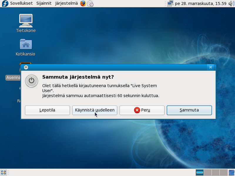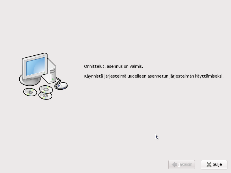 Napsauta Käynnistä uudelleen, minkä jälkeen live-järjestelmä sammuu ja tietokone käynnistyy uudelleen. Ota tietokoneen käynnityessä CD-levy pois asemasta, jotta kiintolevyllä oleva käyttöjärjestelmä pääsee käynnistymään.