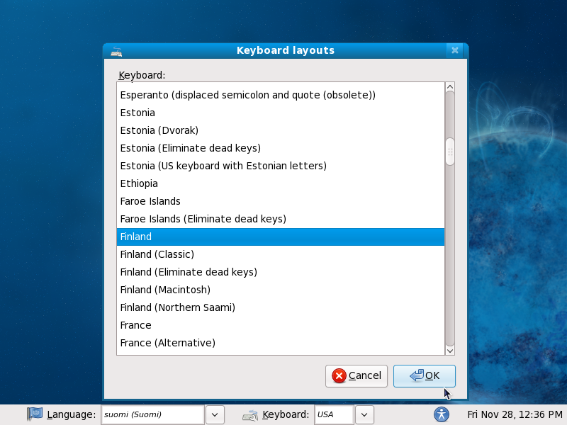 [muokkaa]Fedoran live-ympäristö on cd-levylle pakatty täydellinen Fedora-käyttöjärjestelmä, joka normaalisti kirjoittaa kaikki siihen tehdyt muutokset keskusmuistiin. Tämä mahdollistaa useimpien Fedoran ominaisuuksien turvallisen kokeilun ilman kiintolevyn sisältöön koskemista. Asennusohjelman käyttäminen edellyttää kirjautumista sisään järjestelmään. Ennen kirjautumista on kuitenkin syytä valita käyttöön haluamansa kieli ja näppäinkartta kirjautumisruudun alalaidassa olevista valikoista.