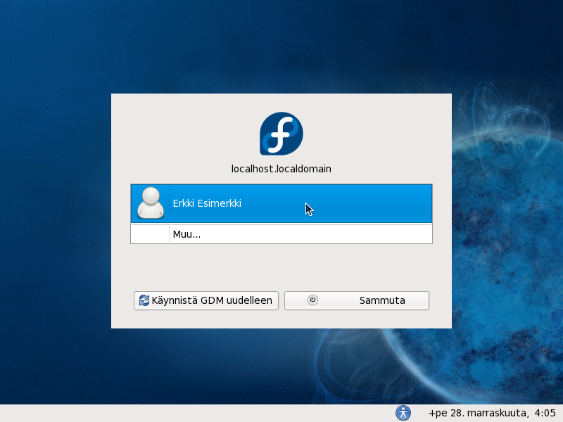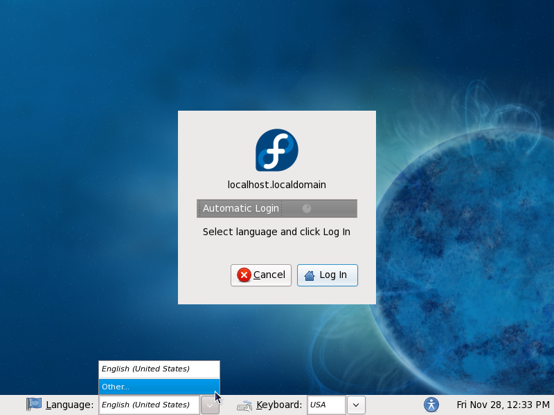 Fedorassa käytetään GDM-kirjautumisruudun kehitysversiota, jossa on tiettyjä puutteita. Tällä hetkellä ei ole tiedossa mahdollisuutta saada live-cd:tä toimimaan suomeksi heti kirjautumisruudusta lähtien. Käytettävää kieltä valittaessa kielen nimi on suomi, mutta se on kuitenkin järjestetty aakkosissa kuten se olisi Finnish, eli se löytyy luettelon alkupäästä. Käytettävää näppäimistöä valittaessa Suomen näppäimistökartat on nimetty Finlandiksi. Asennuksen jälkeen kirjautumisruutu on osittain suomennettu, mutta käännös on hieman puutteellinen.