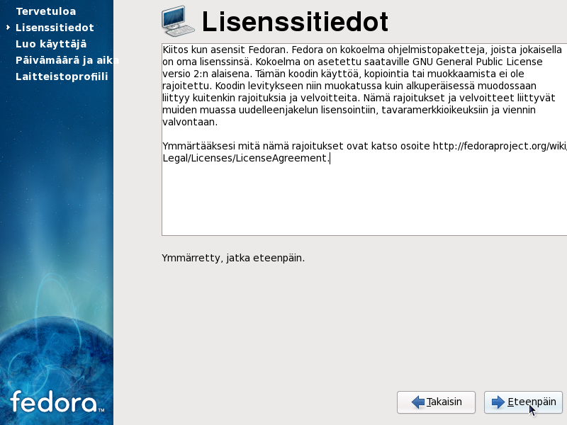 Lisenssitiedoille ei tarvitse tehdä mitään, mutta on hyvä olla tietoinen siitä, millä lisenssillä Fedora-kokoelmaa levitetään. Lue ilmoitus ja jatka napsauttamalla Eteenpäin-painiketta.