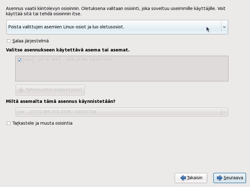 Jos haluat tyhjentää koko kiintolevyn ja antaa sen kokonaan Fedoran käyttöön, valitse Poista valittujen asemien kaikki osiot ja luo oletusosiot.
