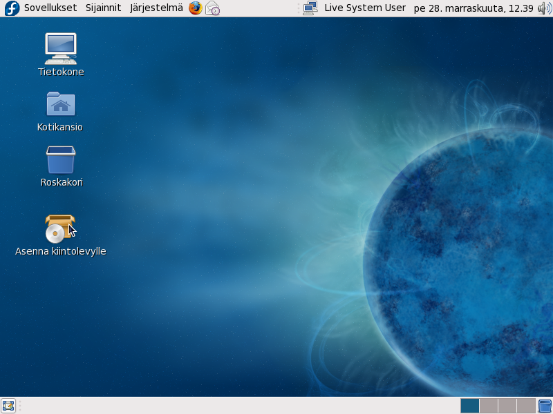 [muokkaa]Fedoran live-ympäristö on nyt valmis käytettäväksi. Voit halutessasi tutustua järjestelmään rauhassa asentamatta sitä. Kun haluat aloittaa asennuksen, kaksoisnapsauta Asenna kiintolevylle -kuvaketta käynnistääksesi Fedoran Anaconda-asennusohjelman.