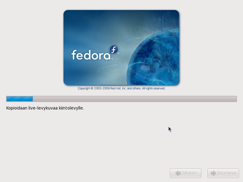 Kun vapaata tilaa on luotu, luodaan automaattisesti Fedoran oletusosiot, minkä jälkeen asennusohjelma siirtyy suoraan kopioimaan Fedoraa kiintolevylle.