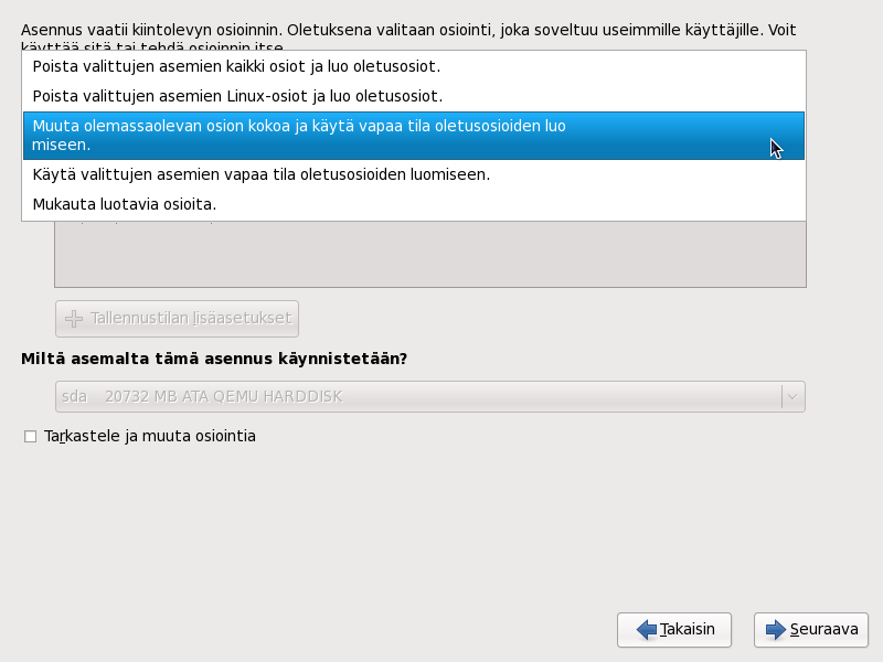 Mikäli olet asentamassa Fedoraa koko levyn käyttävän Windowsin rinnalle, valitse Muuta olemassaolevan osion kokoa ja käytä vapaa tila oletusosioiden luomiseen.
