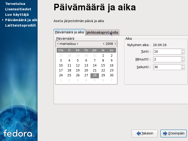 [muokkaa]Fedoran asennus on nyt melkein valmis. Vielä täytyy kuitenkin luoda käyttäjätunnus normaalia tietokoneen käyttöä varten. Tämän ja pari muuta asiaa hoitaa Fedoran Firstboot-ohjelma.