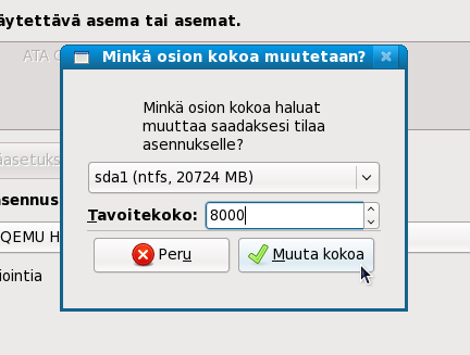 Kun muutettava osio ja sen uusi koko ovat oikein, napsauta Muuta kokoa -painiketta. Tämän jälkeen asennusohjelma vielä varmistaa, että haluat todella tehdä ilmoittamasi muutokset. Vahvista muutokset napsauttamalla Kirjoita muutokset levylle.