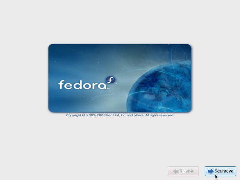 [muokkaa]Fedora 9:n asennus -ohjeesta poiketen tässä oppaassa käytetään asennusmediana Fedoran live-cd:tä, jolta asentaminen on hieman DVD-asennusta suoraviivaisempaa. Live-cd:n levykuvan voi hankkia esimerkiksi Fedoran lataussivulta.