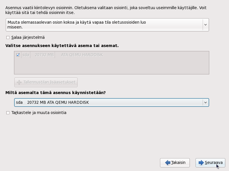 Valitse vielä kiintolevy, jolle haluat järjestelmän asentaa. Useimmissa tietokoneissa on vain yksi kiintolevy, jolloin valintaa ei sen kummemmin tarvitse tehdä. Kun olet valinnut haluamasi osiointiasetukset, jatka napsauttamalla Seuraava-painiketta.