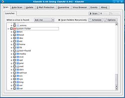[muokkaa]KlamAV on KDE-pohjainen edustaohjelma ClamAV:lle. Siinä on toiminnot hakemistojen skannaukseen, viruskannan päivitykseen ajastuksineen, sähköpostin suojaukseen ja ajettavien tiedostojen (ohjelmien) taustaskannaukseen. Lisäksi sillä voi selata eristettyjä (quarantine) tiedostoja sekä viimeisimpien tapahtumien lokia. KlamAV:stä on myös helppo pääsy ClamAV:n laajaan virustietopankkiin.