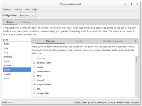 [muokkaa]FirewallD käyttää eri alueita (engl. zones). Oletusalue on määritelty /etc/firewalld/firewalld.conf -tiedostossa.