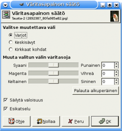 [muokkaa]Väritasapaino vaikuttaa kuvan selkeyteen ja tunnelmaan ja sen muokkaamiseksi löytyy työkalu ylävalikoista Työkalut > Värityökalut > ”Väritasapainon säätö...”. Väritasapainon säätäminen on hyvin kuvakohtaista, joten parhaiten oikean asetuksen löytää kokeilemalla. Tätä varten kannattaa tarkistaa, että ”Väritasapainon säätö” -ikkunassa on esikatselu kohta valittuna, jolloin tehdyt muutokset näkee heti. Muutokset kuitenkin tallentuvat vasta, kun ikkuna suljetaan painamalla OK. Nollaa-painikkeella tehdyt muutokset kumoutuvat ja Peru-painikkeella nollautumisen lisäksi ikkuna sulkeutuu.