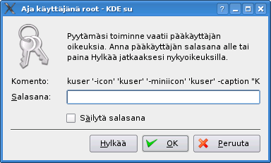 Tällöin sudo kysyy salasanaa, joka oletuksena on käyttäjän oma salasana. Sen voi kuitenkin haluttaessa määrittää kysymään myös pääkäyttäjän salasanaa.