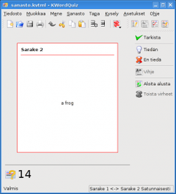 [muokkaa]Sanastojen harjoitteluun sopiva harjoitustyyppi on nimeltään Kysymyskortti. Kysymyskortti -sovelluksen ideana on, että ohjelma kyselee sanastoon syötettyjä sanoja ja käyttäjä kertoo mitkä sanoista hän on tiennyt ja mitä ei. Lopuksi ohjelma antaa mahdollisuuden harjoitella pelkästään niitä sanoja, joita käyttäjä ei ollut tiennyt. Tätä jatkuu niin kauan kunnes käyttäjä on mielestään osannut kaikki sanat. Tilaan siirrytään valitsemalla Mene > Kysymyskortti. Nyt ohjelma alkaa kyselemään sanastoon syötettyjä sanoja. Ikkunan oikeassa laidassa on seuraavia toimintoja.