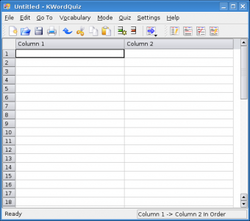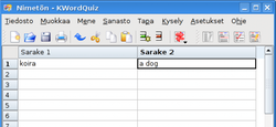 [muokkaa]Omien sanastojen tekeminen on nopeaa ja yksinkertaista. Seuraavassa tehdään esimerkin mukainen sanasto, joka lopuksi tallennetaan omaan kotihakemistoon.KWordQuiz löytyy yleisimmissä käyttöympäristöissä työpöydän käynnistys painikkeen opetusohjelmat-valikosta. Käynnistettäessä KwordQuiz avautuu tyhjään muokkaustilaan.Muokkaustilassa voidaan aloittaa omien sanastojen tekeminen. Sanastoja tehdään syöttämällä kysyttäviä sanoja ja niiden vastineita ohjelman kaksi sarakkeiseen taulukkoon. Taulukon jokaiseen vasemmanpuoleiseen sarakkeeseen voidaan esimerkiksi laittaa suomenkielinen sana ja oikeanpuoleiseen sen vieraskielinen vastine.