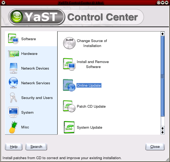 [muokkaa]Päivitys onnistuu myös Konsolesta tai suoraan konsolista. Anna komennoksi root-käyttäjänä yast, valitse Software, sen alta Online update.