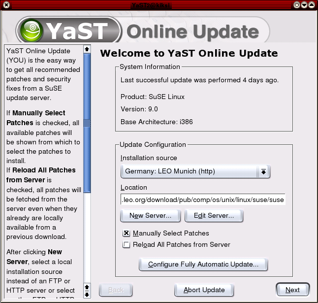Voit valita asennuslähteen (Installation source) lukuisista eri vaihtoehdoista. SuSEn oma on ruuhkainen ja samoin SuNET mutta ainakin kirjoitushetkellä (14.2.2004) LEO (Germany: LEO Munich) toimii moitteettomasti. Voit myös jättää asennuslähteen vaihtamatta. Jos yksi on kovin hidas tai hetkellisesti ruuhkaantunut, joku toinen aina toimii.