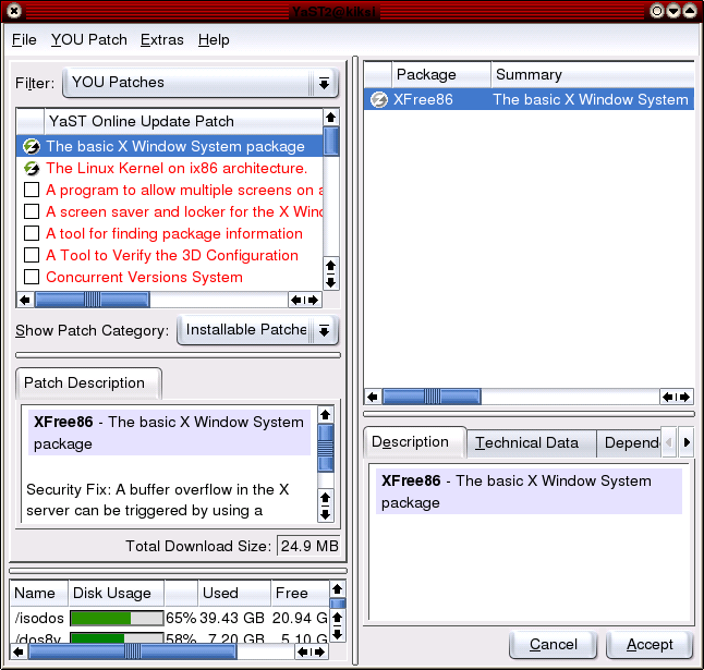 [muokkaa]Mikäli mielestäsi järjestelmää on mukava nikkaroida uuteen uskoon ja asennella tuoreinta ja uusinta kikkakivaa, YaSTin tarjoama päivitystoiminto voi aiheuttaa ikäviä yllätyksiä. Esimerkiksi päivittämällä ensin käsin graafinen käyttöliittymä KDE tuoreimpaan mahdolliseen, YaST voi tarjota turvapaikkoja vanhempaan versioon, joka sitten helposti rikkoo oman asennuksen.