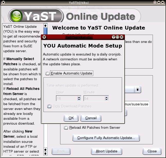 [muokkaa]Mikäli haluat, että järjestelmä automaattisesti päivittää itse itsensä kerran vuorokaudessa, ota ensin ruksi pois kohdasta Manually Select Patches ja napsauta sitten Configure Fully Automatic Update... painiketta. Se avaa uuden pikkulomakkeen edellisen päälle.