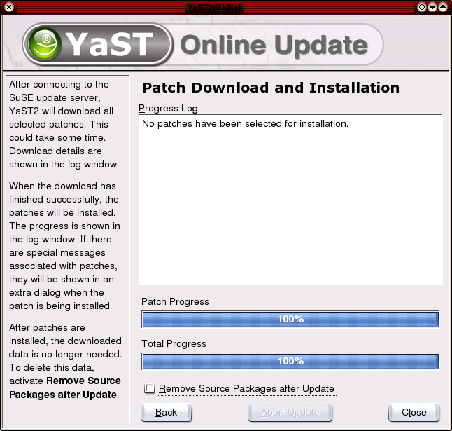 Päivityksen jälkeen kannattaa ruksia Remove Source Packages after Update ennen kuin valitsee Close. Järjestelmäsi on nyt päivitetty.