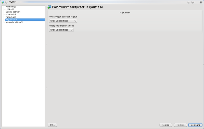 Kirjaustasossa määritetään mitkä tapahtumat kirjataan. Oletusasetukset, vain kriittiset, toimii hyvin joten sekin on viisainta jättää rauhaan. Viimeisessä kohdassa, Muokatut säännöt, voidaan määrittää sallivia poikkeuksia.
