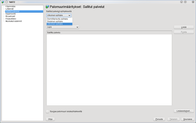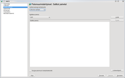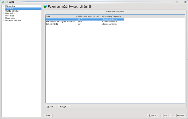 Palomuuri löytyy kohdasta Tietoturva ja käyttäjät=> Palomuuri. Huomioi että napsauttamalla Seuraava ei asiat etene, vaan Yast näyttää yhteenvedon tehdyistä muutoksista ja antaa mahdollisuuden tallentaa tai hylätä ne.