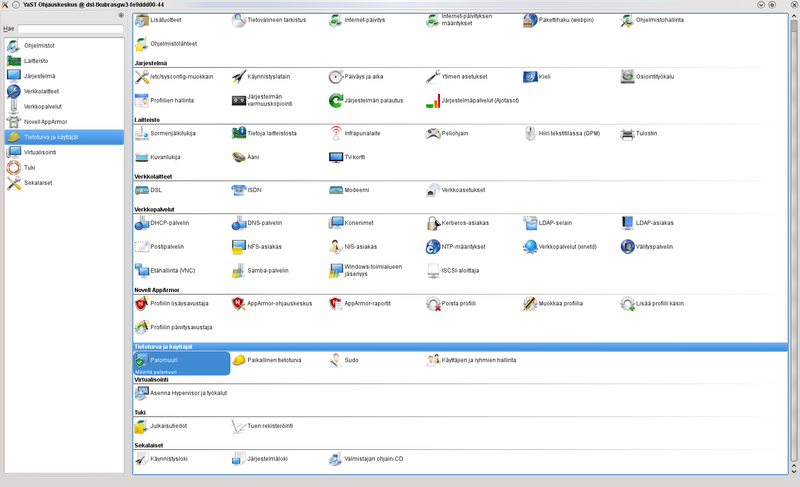 OpenSuSE 11.2:n palomuuri on helppo saattaa toimintakuntoon Yast:n avulla. Huomaa kuitenkin että tämä ohje on kirjoitettu KDE-työpöytäympäristöä käyttäen. GNOMEssa voi olla pieniä, lähinnä graafisia eroavaisuuksia. Yast käynnistyy kohdasta Sovellukset=>Järjestelmä=>Järjestelmävalvojan asetukset tai komentokehotteessa antamalla pääkäyttäjän oikeuksilla komennon Yast. Graafinen ja merkkipohjainen Yast on toiminnoiltaan identtiset, ja siksi täällä annetaan esimerkit yleisemmin käytettyyn graafiseen.