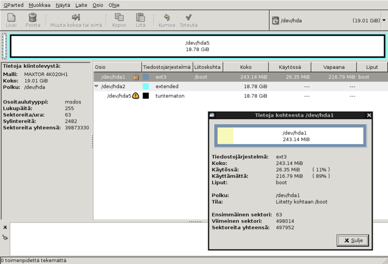 Kuvankaappaus Gparted-ohjelmasta. Kuvaa saa käyttää täysin vapaasti.
