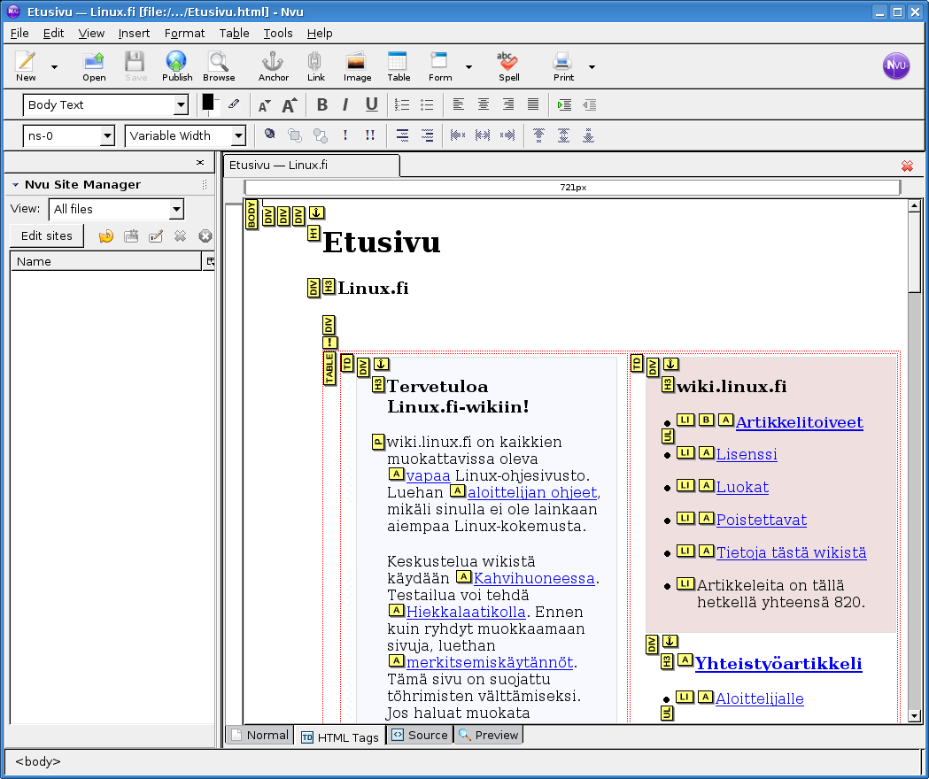 Nvu näyttämässä HTML Tags -näkymässä tämän wikin etusivua.