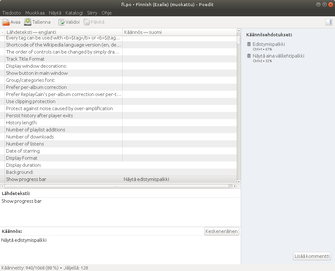 [muokkaa]Kuvakaappaus Ubuntun poedit ohjelmasta, jossa on käynnissä suomennos.