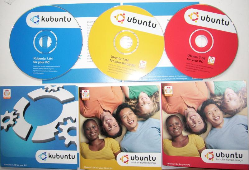 Shipitistä tilattuja Ubuntu 7.04:n levyjä.