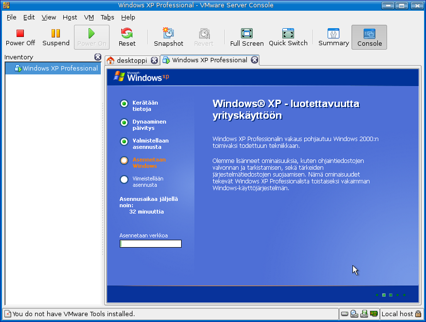 | nykyinen | 14. syyskuuta 2006 kello 22.25 | 875 × 662 (193 KiB) | Heikki (keskustelu | muokkaukset) | Windows XP:n asennus vmwaressa |