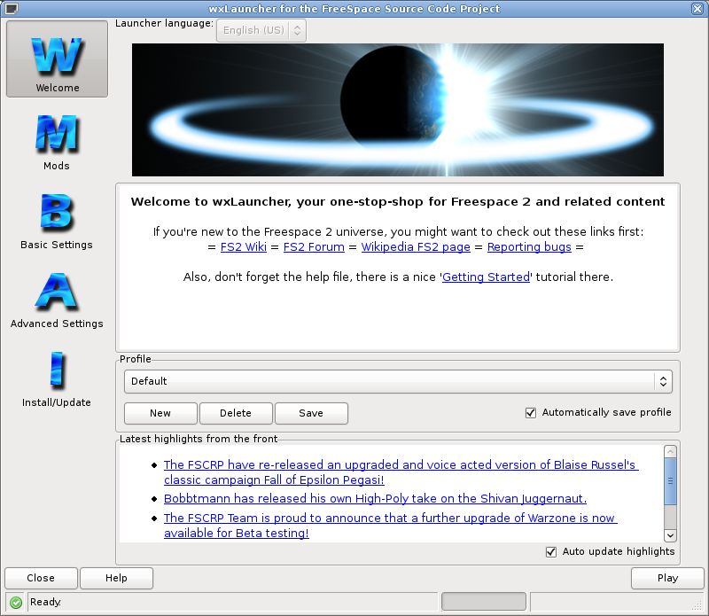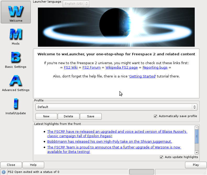 [muokkaa]wxlauncher on käynnistin Freespace 2 lähdekoodiprojektin peliin.