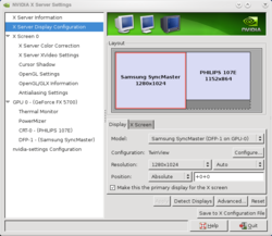 Kyseistä työkalua voi käyttää monien näyttöihin ja näytönohjaimeen liittyvien asetusten säätämiseen. Näyttöjen sijoittelu ja kahden näytön käyttöön vaikuttavat asetukset tehdään X Server Display Configuration -osiossa.